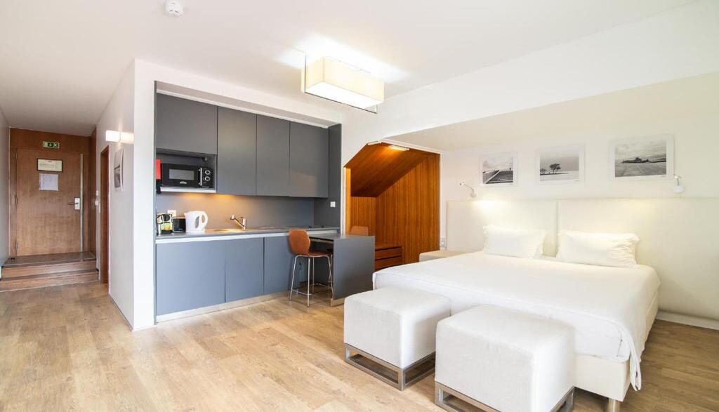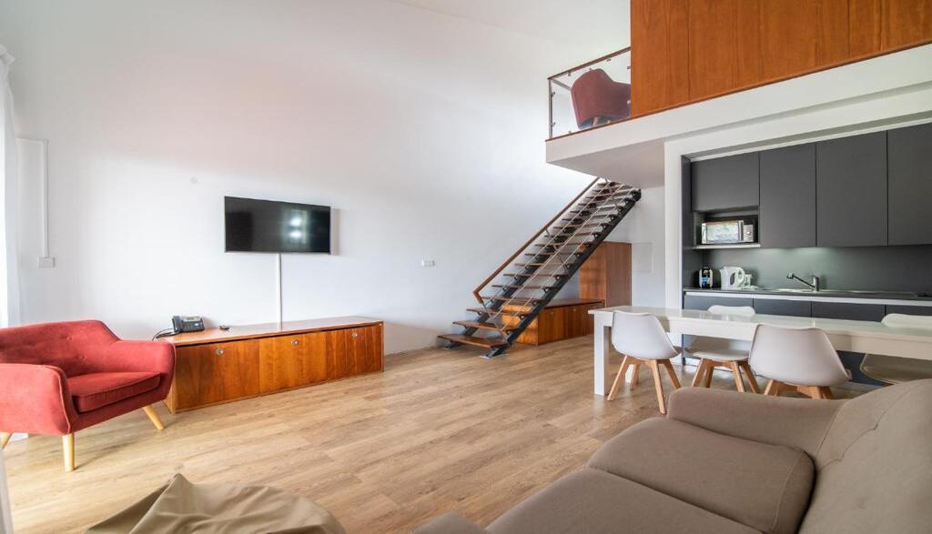 - Alojamento premium com dois pisos ? cama Queen ou duas camas Twin no espaço superior, e sala de estar com kitchenette no piso inferior.