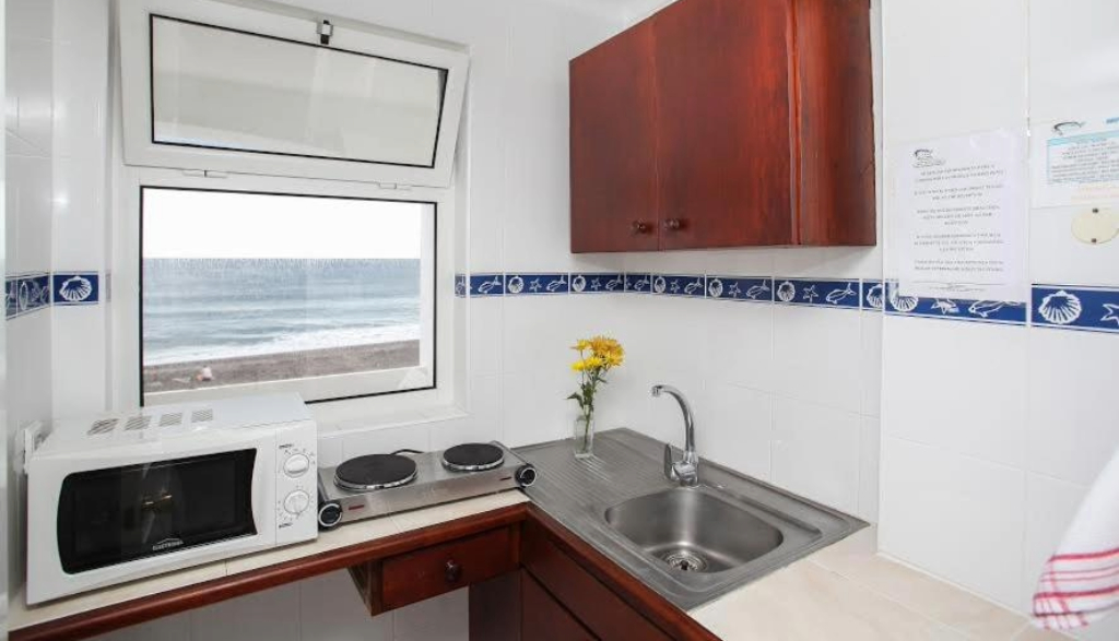 - Cozinha com frigorífico, placa de fogão, micro-ondas e utensílios de cozinha