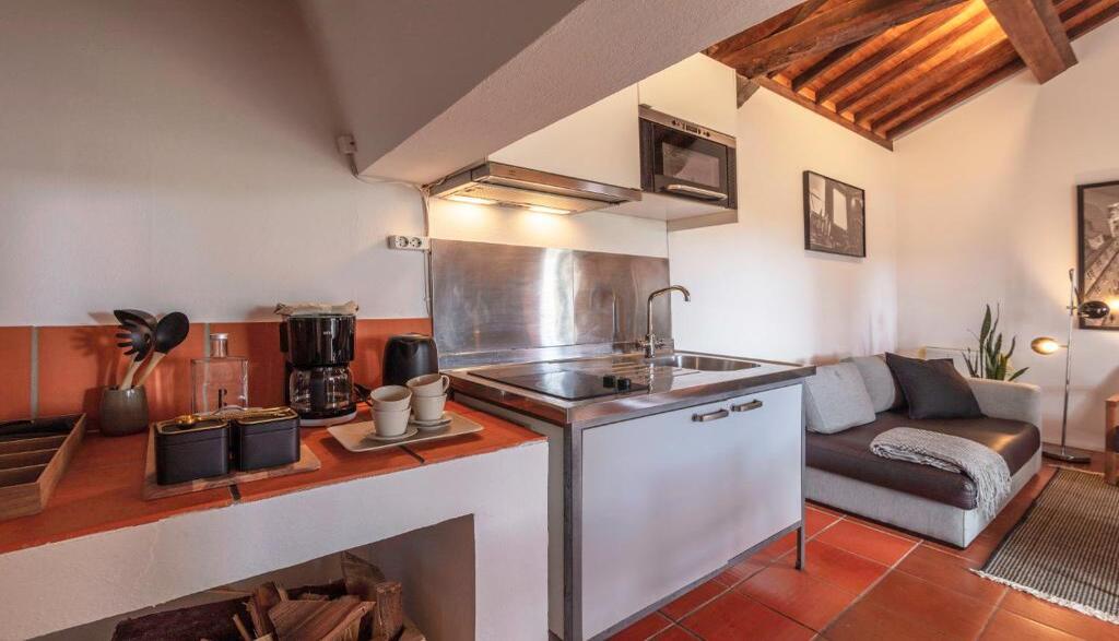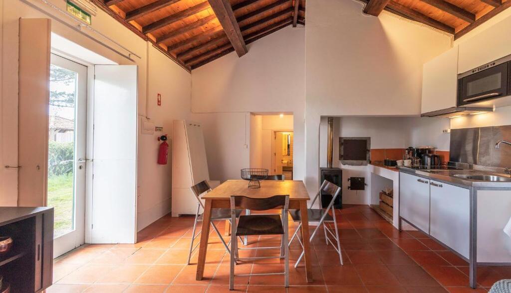 - Cozinha com frigorífico, placa de fogão, micro-ondas, torradeira, máquina de café, chaleira elétrica e utensílios de cozinha