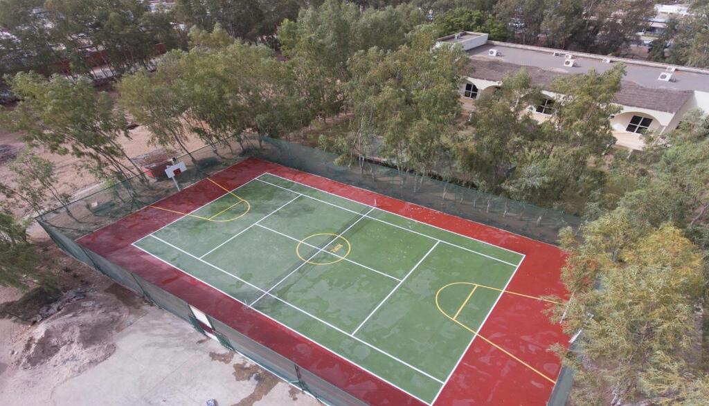 Jardim com coqueiros e baobás, boa vegetação envolvente.